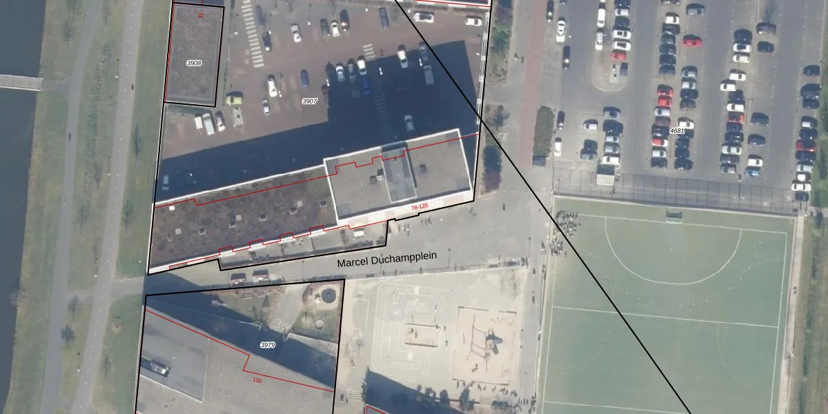 Het perceel waarop Marcel Duchampplein 111 staat heeft een oppervlakte van 4809 m². Dit is een zeer groot perceel. De perceeloppervlakte wordt geregistreerd door het Kadaster. Gedetailleerde informatie over de maten van dit perceel kunt u vinden in het rapport Kadastrale kaart met maatvoering van Marcel Duchampplein 111.