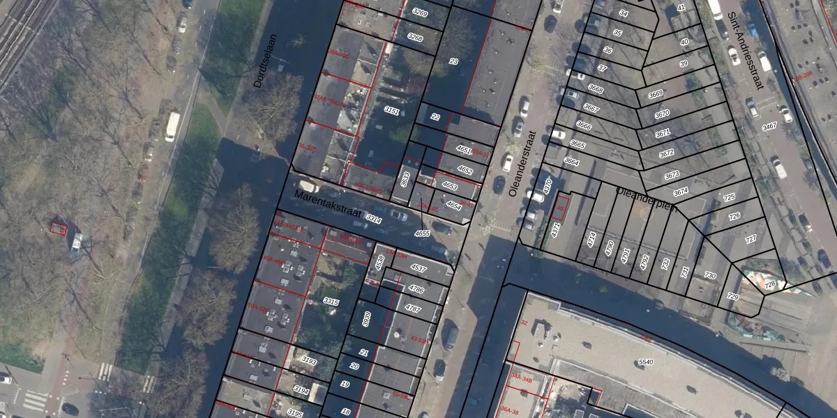 Marentakstraat 12-A is gelegen op kadastraal perceel CLS00G4655. Deze kadastrale aanduiding is uniek en wordt gebruikt door het Kadaster om eigendomsrechten en andere zakelijke rechten vast te leggen. Het perceel maakt onderdeel uit van de kadastrale gemeente Charlois.