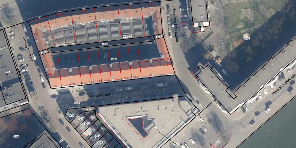 Marinestraat 5-A is gelegen op kadastraal perceel RTD05Q5319. Deze kadastrale aanduiding is uniek en wordt gebruikt door het Kadaster om eigendomsrechten en andere zakelijke rechten vast te leggen. Het perceel maakt onderdeel uit van de kadastrale gemeente Rotterdam.