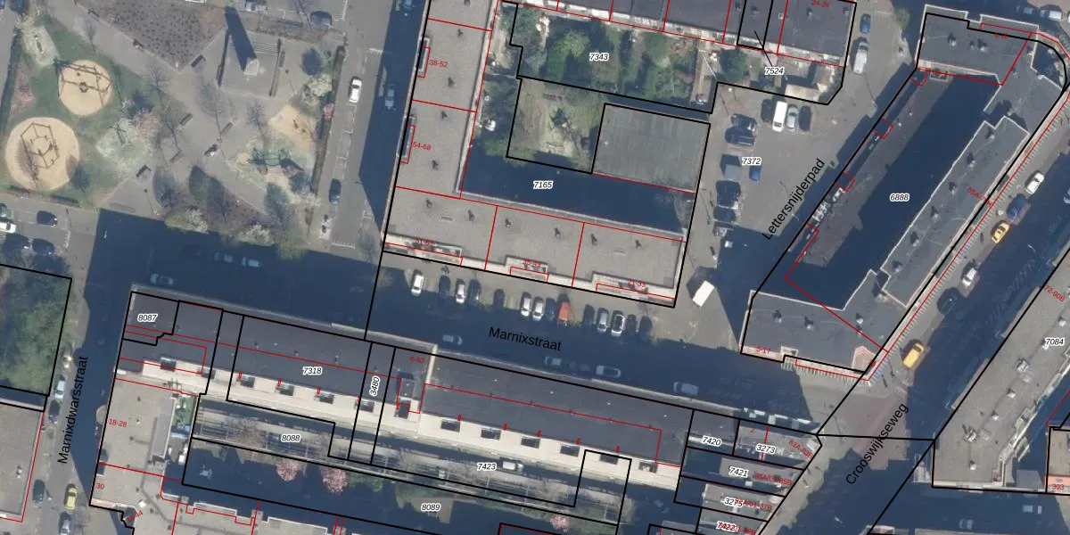Het perceel waarop Marnixstraat 35 staat heeft een oppervlakte van 2165 m². Dit is een zeer groot perceel. De perceeloppervlakte wordt geregistreerd door het Kadaster. Gedetailleerde informatie over de maten van dit perceel kunt u vinden in het rapport Kadastrale kaart met maatvoering van Marnixstraat 35.