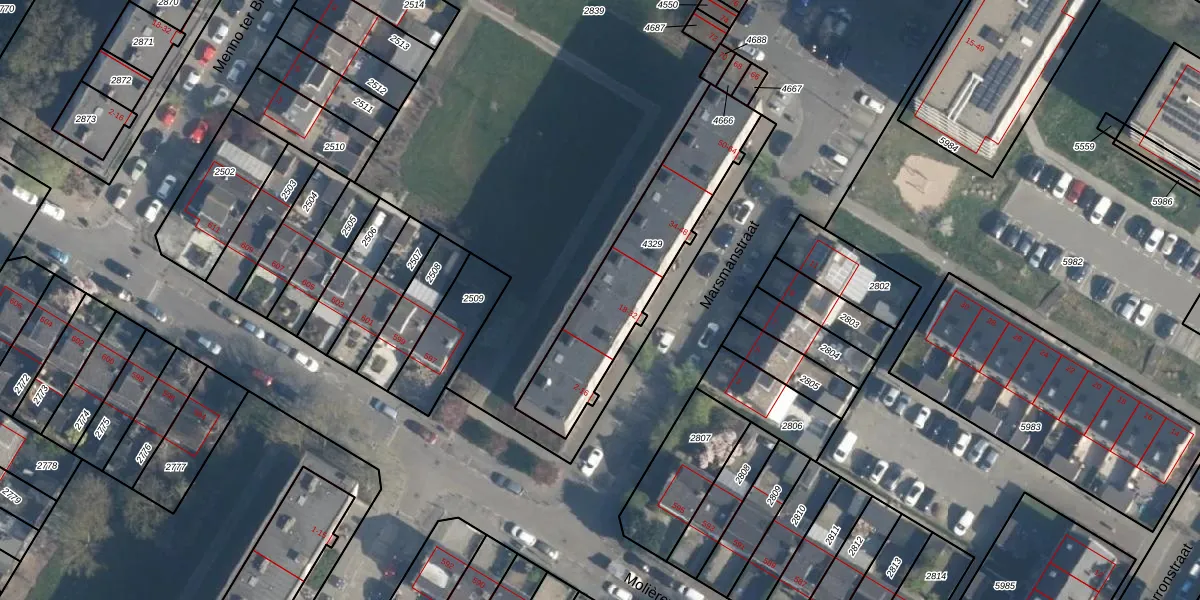 Het perceel waarop Marsmanstraat 24 staat heeft een oppervlakte van 638 m². Dit is een groot perceel. De perceeloppervlakte wordt geregistreerd door het Kadaster. Gedetailleerde informatie over de maten van dit perceel kunt u vinden in het rapport Kadastrale kaart met maatvoering van Marsmanstraat 24.