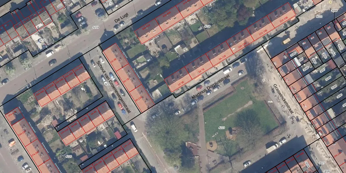 Het perceel waarop Martinus Dorpiusstraat 1-B staat heeft een oppervlakte van 6418 m². Dit is een zeer groot perceel. De perceeloppervlakte wordt geregistreerd door het Kadaster. Gedetailleerde informatie over de maten van dit perceel kunt u vinden in het rapport Kadastrale kaart met maatvoering van Martinus Dorpiusstraat 1-B.