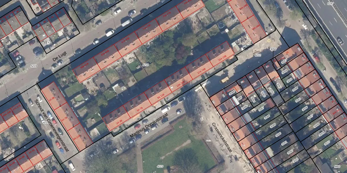 Het perceel waarop Martinus Dorpiusstraat 13-B staat heeft een oppervlakte van 6418 m². Dit is een zeer groot perceel. De perceeloppervlakte wordt geregistreerd door het Kadaster. Gedetailleerde informatie over de maten van dit perceel kunt u vinden in het rapport Kadastrale kaart met maatvoering van Martinus Dorpiusstraat 13-B.