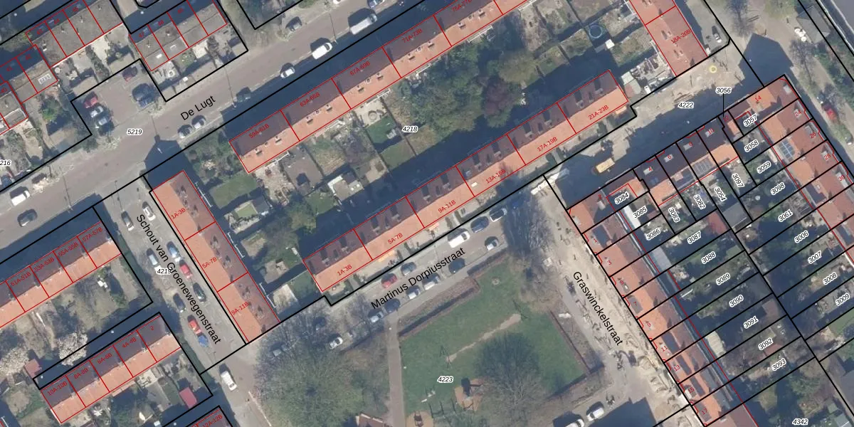 Het perceel waarop Martinus Dorpiusstraat 9-A staat heeft een oppervlakte van 6418 m². Dit is een zeer groot perceel. De perceeloppervlakte wordt geregistreerd door het Kadaster. Gedetailleerde informatie over de maten van dit perceel kunt u vinden in het rapport Kadastrale kaart met maatvoering van Martinus Dorpiusstraat 9-A.