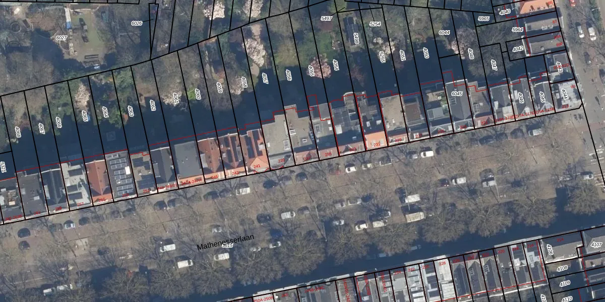 Het perceel waarop Mathenesserlaan 237 staat heeft een oppervlakte van 400 m². Dit is een groot perceel. De perceeloppervlakte wordt geregistreerd door het Kadaster. Gedetailleerde informatie over de maten van dit perceel kunt u vinden in het rapport Kadastrale kaart met maatvoering van Mathenesserlaan 237.