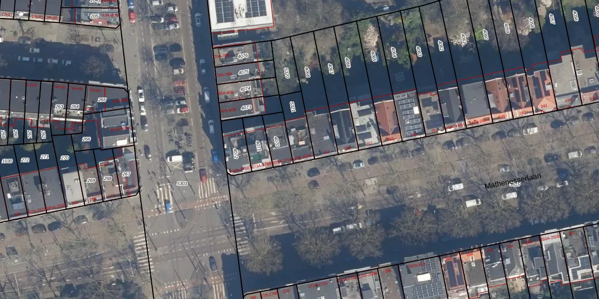 Mathenesserlaan 263 is gelegen op kadastraal perceel DHV00C5321. Deze kadastrale aanduiding is uniek en wordt gebruikt door het Kadaster om eigendomsrechten en andere zakelijke rechten vast te leggen. Het perceel maakt onderdeel uit van de kadastrale gemeente Delfshaven.