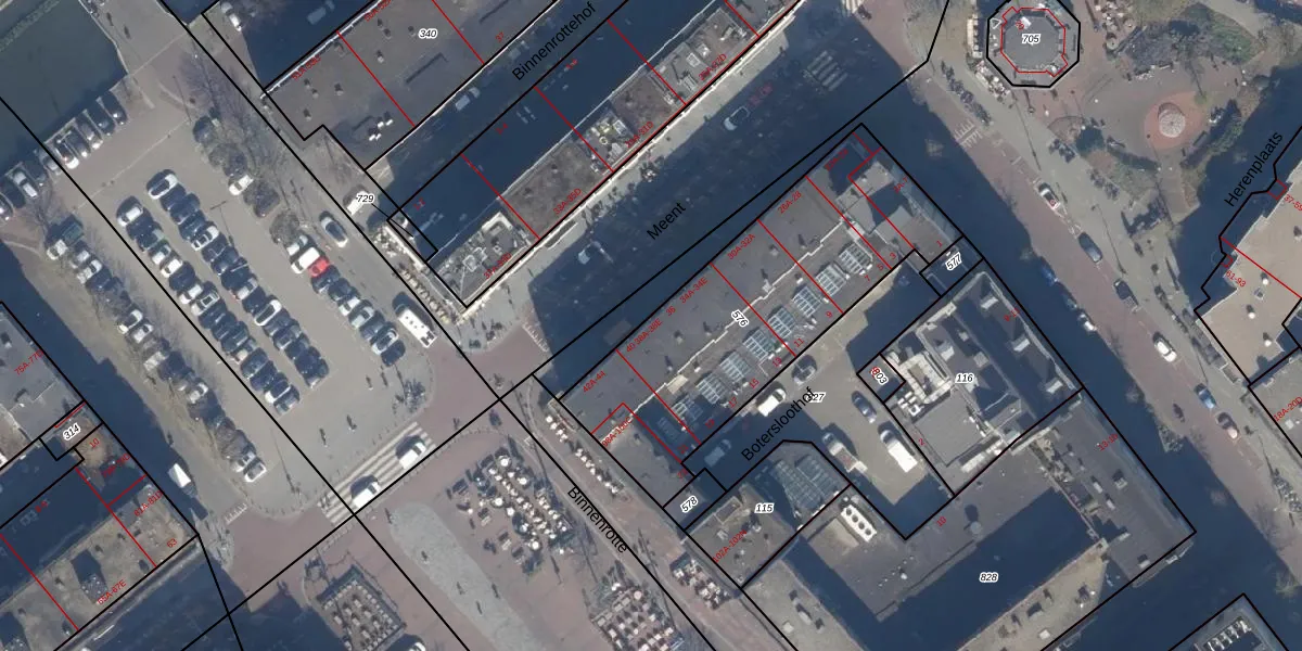 Meent 38-B is gelegen op kadastraal perceel RTD04AF576. Deze kadastrale aanduiding is uniek en wordt gebruikt door het Kadaster om eigendomsrechten en andere zakelijke rechten vast te leggen. Het perceel maakt onderdeel uit van de kadastrale gemeente Rotterdam.