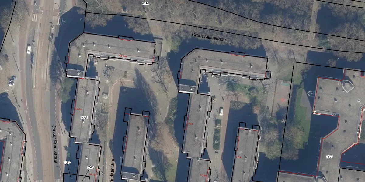 Het adres ligt op het perceel RTD07-R-6943, dat zich in de kadastrale gemeente Rotterdam bevindt. De oppervlakte van het perceel is 2446 m². Dat is groter dan gemiddeld in Rotterdam, waar de gemiddelde perceeloppervlakte op 506,86 m² ligt. De grootste perceeloppervlakte in de kadastrale gemeente is 10,8 ha. De kleinste oppervlakte bedraagt 0 m². Op het perceel zijn 112 adressen aanwezig. De huidige grenzen van het perceel zijn digitaal in de Basisregistratie Kadaster (BRK) geregistreerd op 15-02-2011.