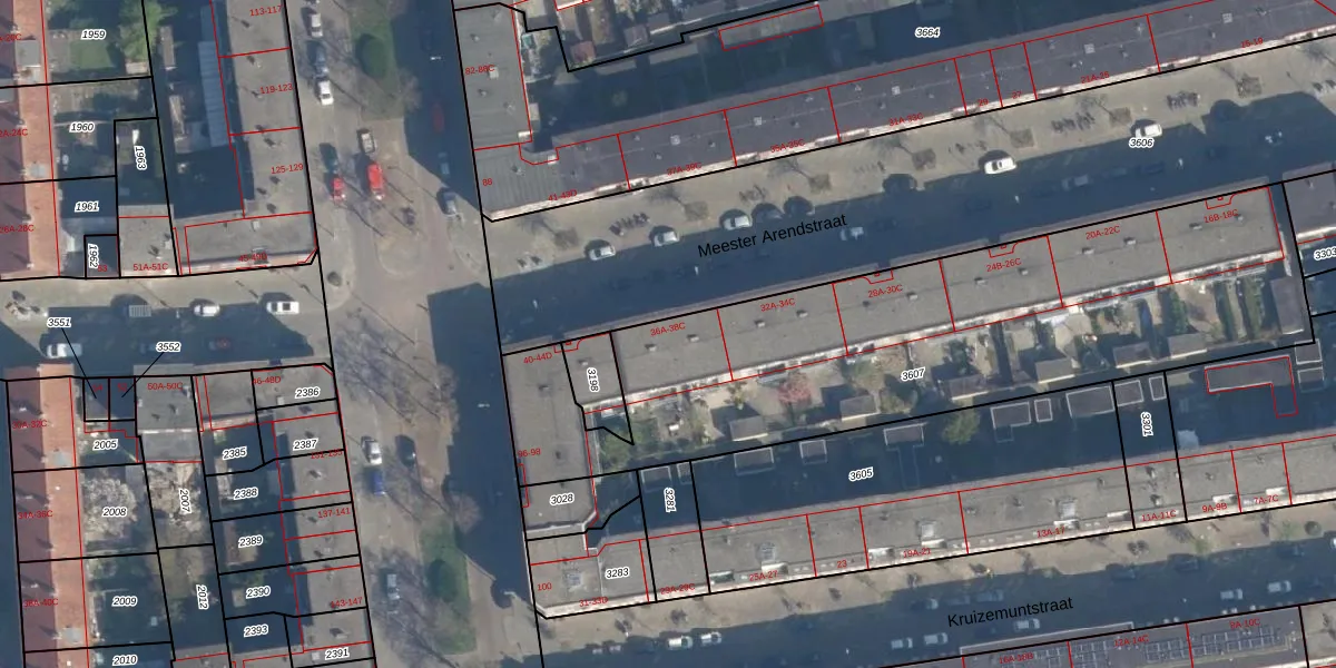 Meester Arendstraat 36-A is gelegen op kadastraal perceel CLS00H3607. Deze kadastrale aanduiding is uniek en wordt gebruikt door het Kadaster om eigendomsrechten en andere zakelijke rechten vast te leggen. Het perceel maakt onderdeel uit van de kadastrale gemeente Charlois.