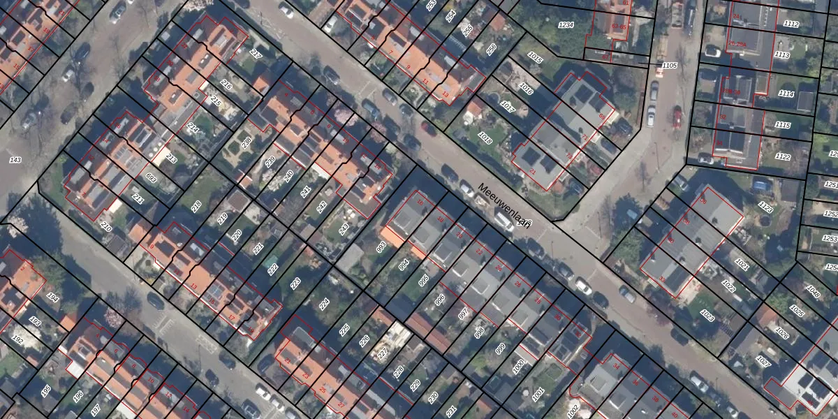 Het perceel waarop Meeuwenlaan 16 staat heeft een oppervlakte van 314 m². Dit is een groot perceel. De perceeloppervlakte wordt geregistreerd door het Kadaster. Gedetailleerde informatie over de maten van dit perceel kunt u vinden in het rapport Kadastrale kaart met maatvoering van Meeuwenlaan 16.
