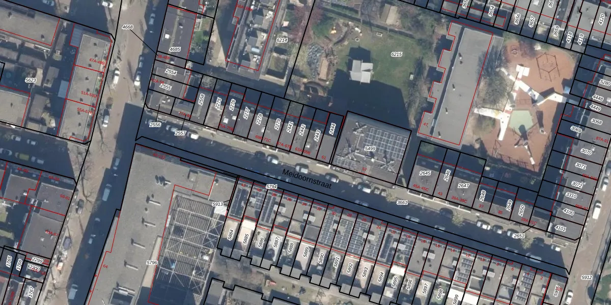 Meidoornstraat 65-A is gelegen op kadastraal perceel RTD07W2443. Deze kadastrale aanduiding is uniek en wordt gebruikt door het Kadaster om eigendomsrechten en andere zakelijke rechten vast te leggen. Het perceel maakt onderdeel uit van de kadastrale gemeente Rotterdam.