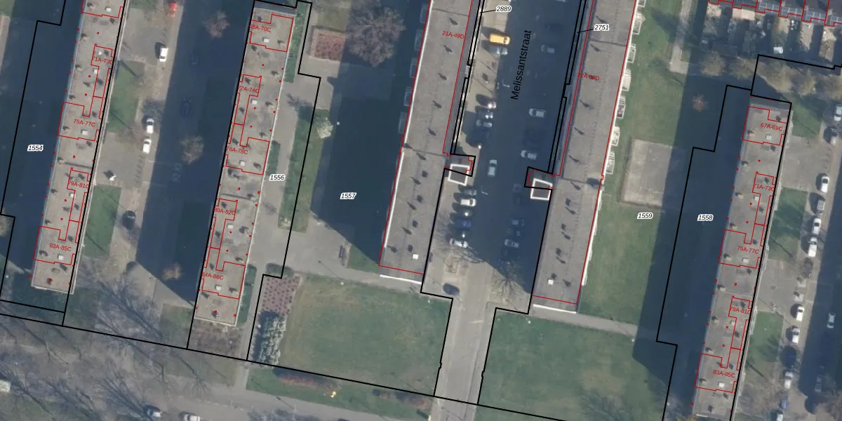 Melissantstraat 45-B is gelegen op kadastraal perceel CLS00L1557. Deze kadastrale aanduiding is uniek en wordt gebruikt door het Kadaster om eigendomsrechten en andere zakelijke rechten vast te leggen. Het perceel maakt onderdeel uit van de kadastrale gemeente Charlois.