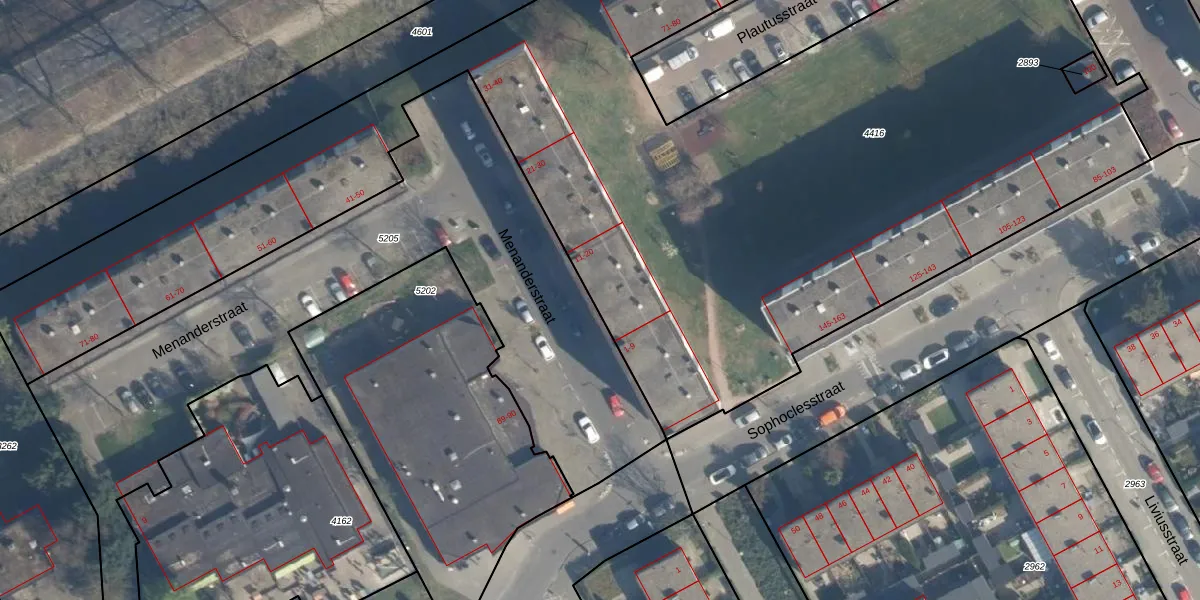 Het perceel waarop Menanderstraat 16 staat heeft een oppervlakte van 1,3 ha. Dit is een zeer groot perceel. De perceeloppervlakte wordt geregistreerd door het Kadaster. Gedetailleerde informatie over de maten van dit perceel kunt u vinden in het rapport Kadastrale kaart met maatvoering van Menanderstraat 16.