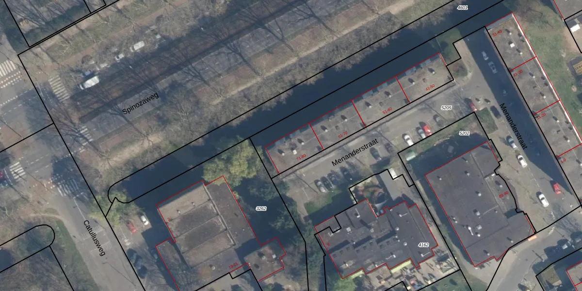 Het perceel waarop Menanderstraat 75 staat heeft een oppervlakte van 1,3 ha. Dit is een zeer groot perceel. De perceeloppervlakte wordt geregistreerd door het Kadaster. Gedetailleerde informatie over de maten van dit perceel kunt u vinden in het rapport Kadastrale kaart met maatvoering van Menanderstraat 75.