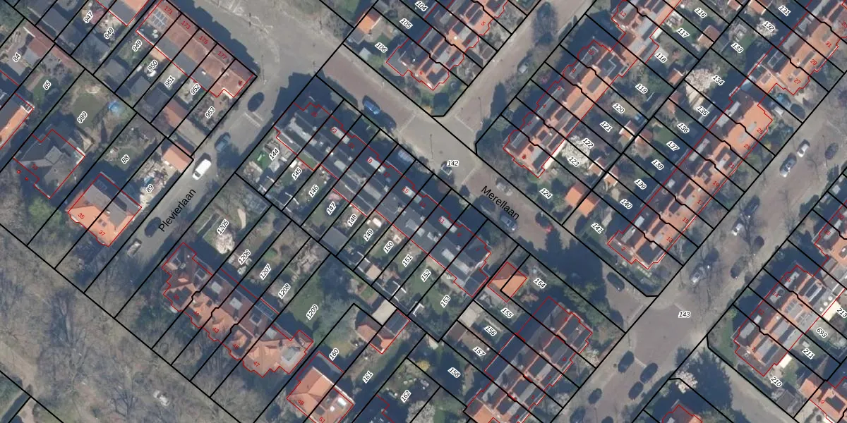 Het perceel waarop Merellaan 13 staat heeft een oppervlakte van 165 m². Dit is een middelgroot perceel. De perceeloppervlakte wordt geregistreerd door het Kadaster. Gedetailleerde informatie over de maten van dit perceel kunt u vinden in het rapport Kadastrale kaart met maatvoering van Merellaan 13.