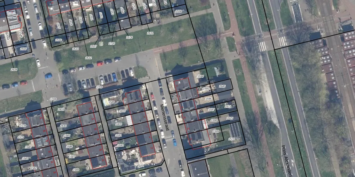 Het perceel waarop Mertensstraat 2 staat heeft een oppervlakte van 215 m². Dit is een middelgroot perceel. De perceeloppervlakte wordt geregistreerd door het Kadaster. Gedetailleerde informatie over de maten van dit perceel kunt u vinden in het rapport Kadastrale kaart met maatvoering van Mertensstraat 2.