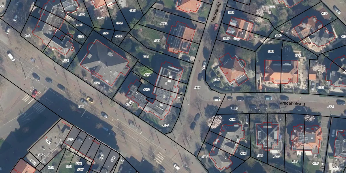 Merulaweg 13 is gelegen op kadastraal perceel KLG00G4171. Deze kadastrale aanduiding is uniek en wordt gebruikt door het Kadaster om eigendomsrechten en andere zakelijke rechten vast te leggen. Het perceel maakt onderdeel uit van de kadastrale gemeente Kralingen.