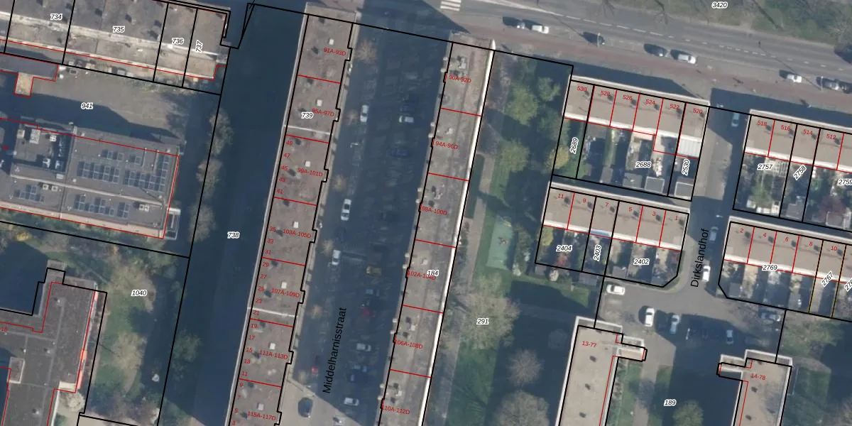 Middelharnisstraat 100-A is gelegen op kadastraal perceel CLS00L184. Deze kadastrale aanduiding is uniek en wordt gebruikt door het Kadaster om eigendomsrechten en andere zakelijke rechten vast te leggen. Het perceel maakt onderdeel uit van de kadastrale gemeente Charlois.