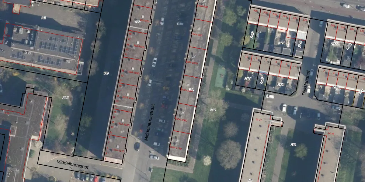 Middelharnisstraat 104-A is gelegen op kadastraal perceel CLS00L184. Deze kadastrale aanduiding is uniek en wordt gebruikt door het Kadaster om eigendomsrechten en andere zakelijke rechten vast te leggen. Het perceel maakt onderdeel uit van de kadastrale gemeente Charlois.