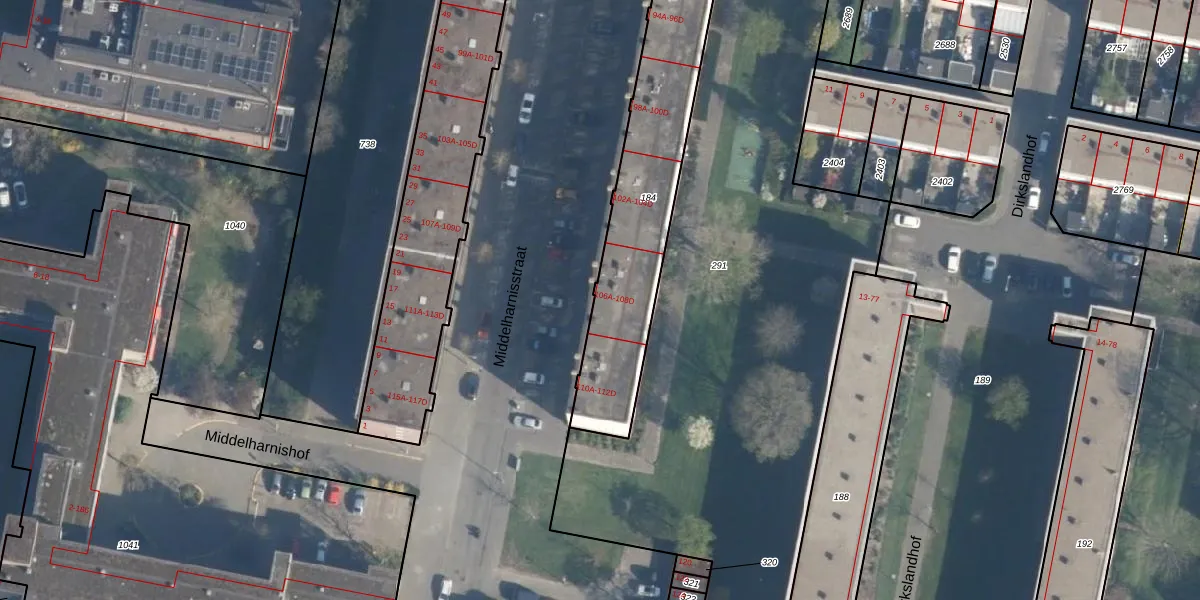 Middelharnisstraat 106-B is gelegen op kadastraal perceel CLS00L184. Deze kadastrale aanduiding is uniek en wordt gebruikt door het Kadaster om eigendomsrechten en andere zakelijke rechten vast te leggen. Het perceel maakt onderdeel uit van de kadastrale gemeente Charlois.