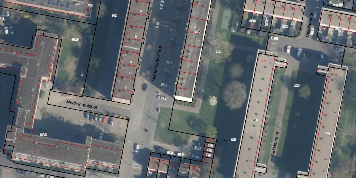 Middelharnisstraat 112-A is gelegen op kadastraal perceel CLS00L184. Deze kadastrale aanduiding is uniek en wordt gebruikt door het Kadaster om eigendomsrechten en andere zakelijke rechten vast te leggen. Het perceel maakt onderdeel uit van de kadastrale gemeente Charlois.