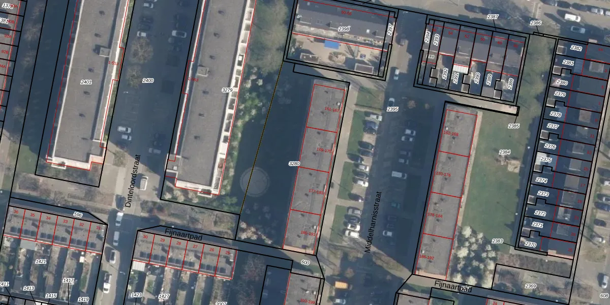 Middelharnisstraat 169 is gelegen op kadastraal perceel CLS00L3280. Deze kadastrale aanduiding is uniek en wordt gebruikt door het Kadaster om eigendomsrechten en andere zakelijke rechten vast te leggen. Het perceel maakt onderdeel uit van de kadastrale gemeente Charlois.