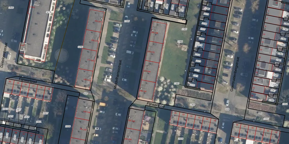 Het perceel waarop Middelharnisstraat 184 staat heeft een oppervlakte van 2081 m². Dit is een zeer groot perceel. De perceeloppervlakte wordt geregistreerd door het Kadaster. Gedetailleerde informatie over de maten van dit perceel kunt u vinden in het rapport Kadastrale kaart met maatvoering van Middelharnisstraat 184.