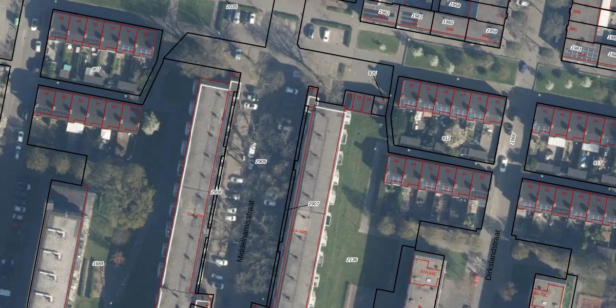 Het perceel waarop Middelharnisstraat 26-C staat heeft een oppervlakte van 4457 m². Dit is een zeer groot perceel. De perceeloppervlakte wordt geregistreerd door het Kadaster. Gedetailleerde informatie over de maten van dit perceel kunt u vinden in het rapport Kadastrale kaart met maatvoering van Middelharnisstraat 26-C.