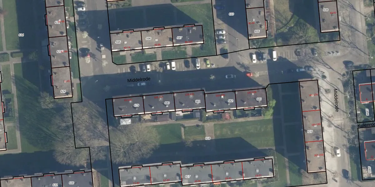 Middelrode 119 is gelegen op kadastraal perceel CLS00K681. Deze kadastrale aanduiding is uniek en wordt gebruikt door het Kadaster om eigendomsrechten en andere zakelijke rechten vast te leggen. Het perceel maakt onderdeel uit van de kadastrale gemeente Charlois.