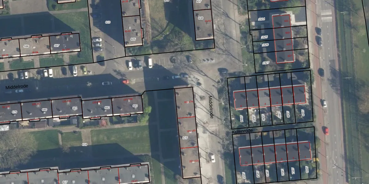 Middelrode 161 is gelegen op kadastraal perceel CLS00K615. Deze kadastrale aanduiding is uniek en wordt gebruikt door het Kadaster om eigendomsrechten en andere zakelijke rechten vast te leggen. Het perceel maakt onderdeel uit van de kadastrale gemeente Charlois.
