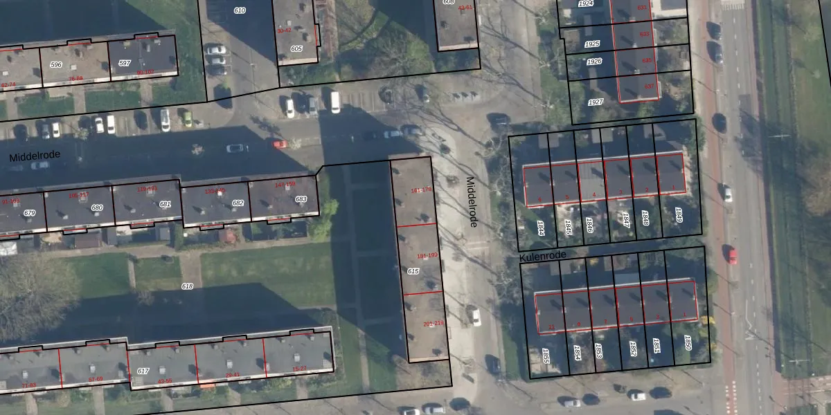 Middelrode 177 is gelegen op kadastraal perceel CLS00K615. Deze kadastrale aanduiding is uniek en wordt gebruikt door het Kadaster om eigendomsrechten en andere zakelijke rechten vast te leggen. Het perceel maakt onderdeel uit van de kadastrale gemeente Charlois.