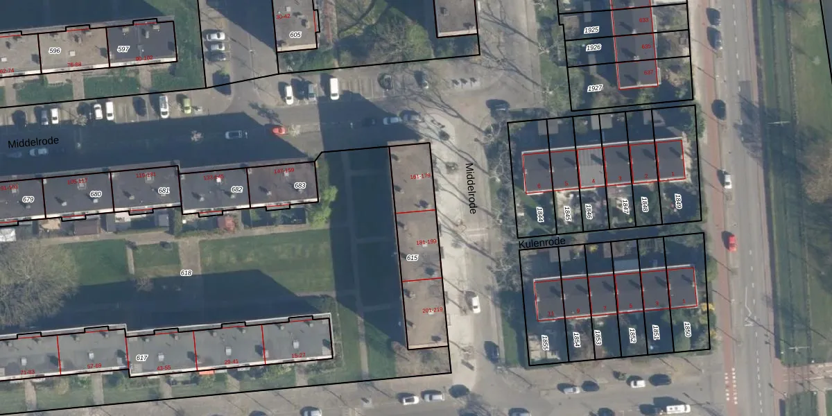 Middelrode 179 is gelegen op kadastraal perceel CLS00K615. Deze kadastrale aanduiding is uniek en wordt gebruikt door het Kadaster om eigendomsrechten en andere zakelijke rechten vast te leggen. Het perceel maakt onderdeel uit van de kadastrale gemeente Charlois.