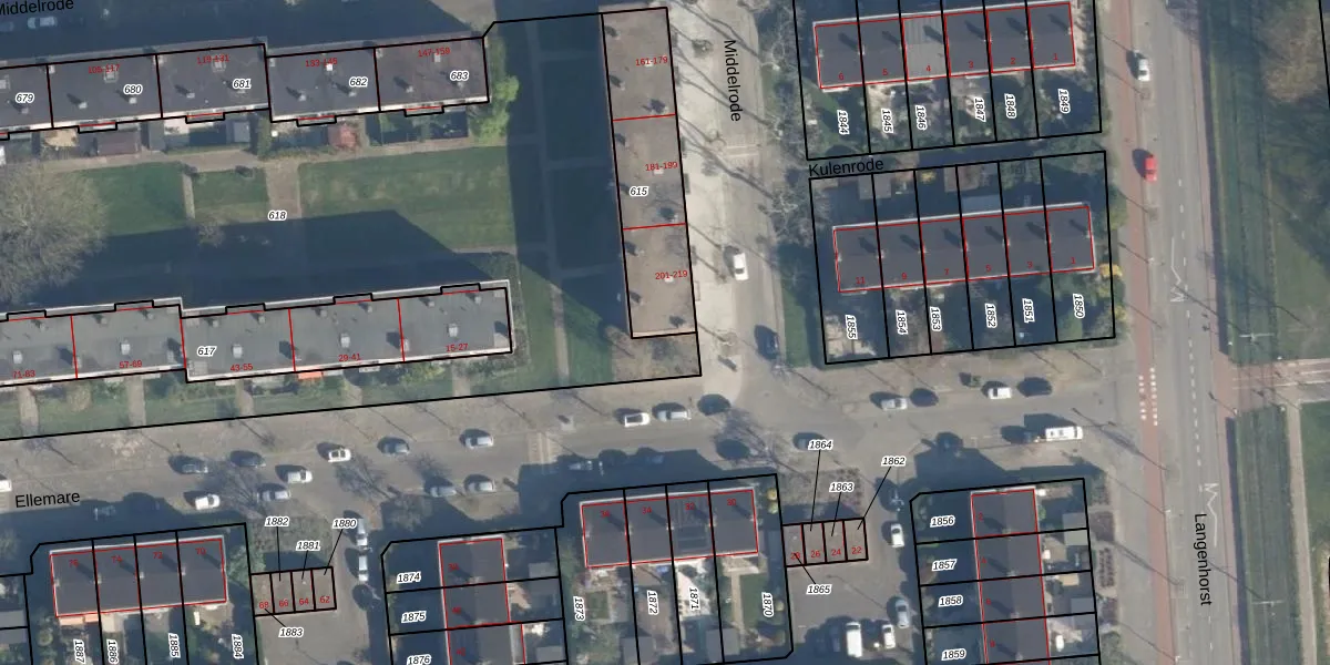 Middelrode 219 is gelegen op kadastraal perceel CLS00K615. Deze kadastrale aanduiding is uniek en wordt gebruikt door het Kadaster om eigendomsrechten en andere zakelijke rechten vast te leggen. Het perceel maakt onderdeel uit van de kadastrale gemeente Charlois.