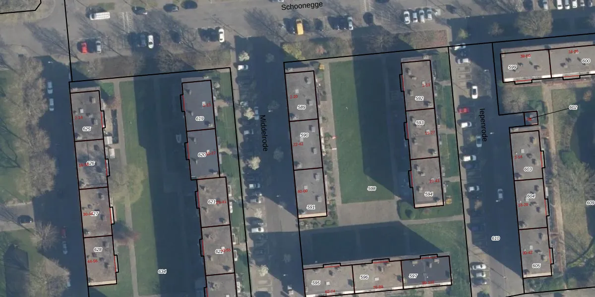 Middelrode 24 is gelegen op kadastraal perceel CLS00K590. Deze kadastrale aanduiding is uniek en wordt gebruikt door het Kadaster om eigendomsrechten en andere zakelijke rechten vast te leggen. Het perceel maakt onderdeel uit van de kadastrale gemeente Charlois.