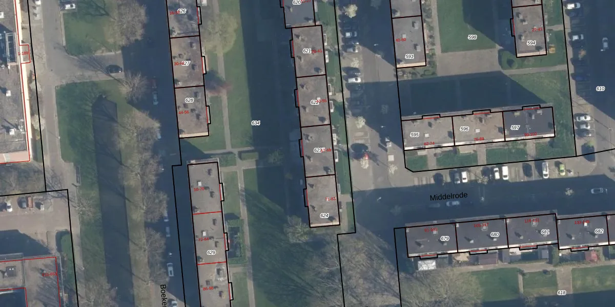 Middelrode 61 is gelegen op kadastraal perceel CLS00K623. Deze kadastrale aanduiding is uniek en wordt gebruikt door het Kadaster om eigendomsrechten en andere zakelijke rechten vast te leggen. Het perceel maakt onderdeel uit van de kadastrale gemeente Charlois.