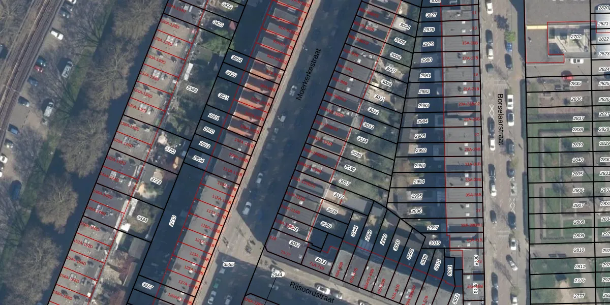 Moerkerkestraat 106-B-01 is gelegen op kadastraal perceel CLS00G3036. Deze kadastrale aanduiding is uniek en wordt gebruikt door het Kadaster om eigendomsrechten en andere zakelijke rechten vast te leggen. Het perceel maakt onderdeel uit van de kadastrale gemeente Charlois.