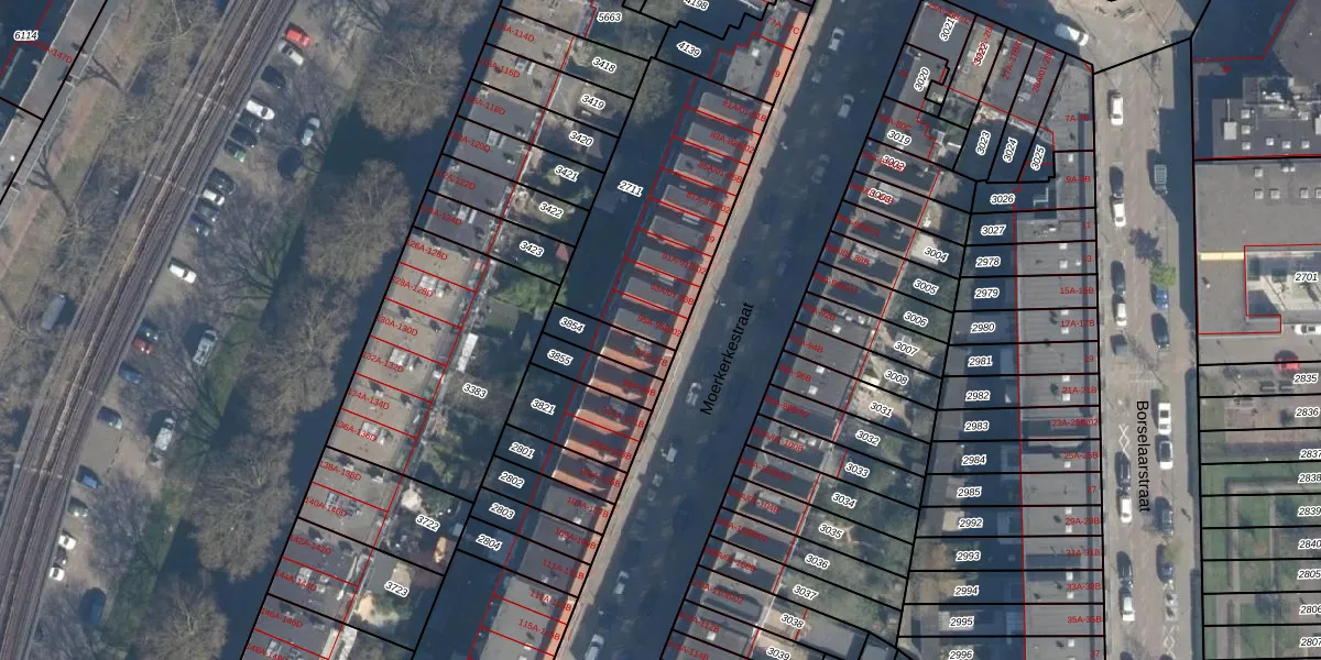 Het perceel waarop Moerkerkestraat 95-A staat heeft een oppervlakte van 800 m². Dit is een groot perceel. De perceeloppervlakte wordt geregistreerd door het Kadaster. Gedetailleerde informatie over de maten van dit perceel kunt u vinden in het rapport Kadastrale kaart met maatvoering van Moerkerkestraat 95-A.