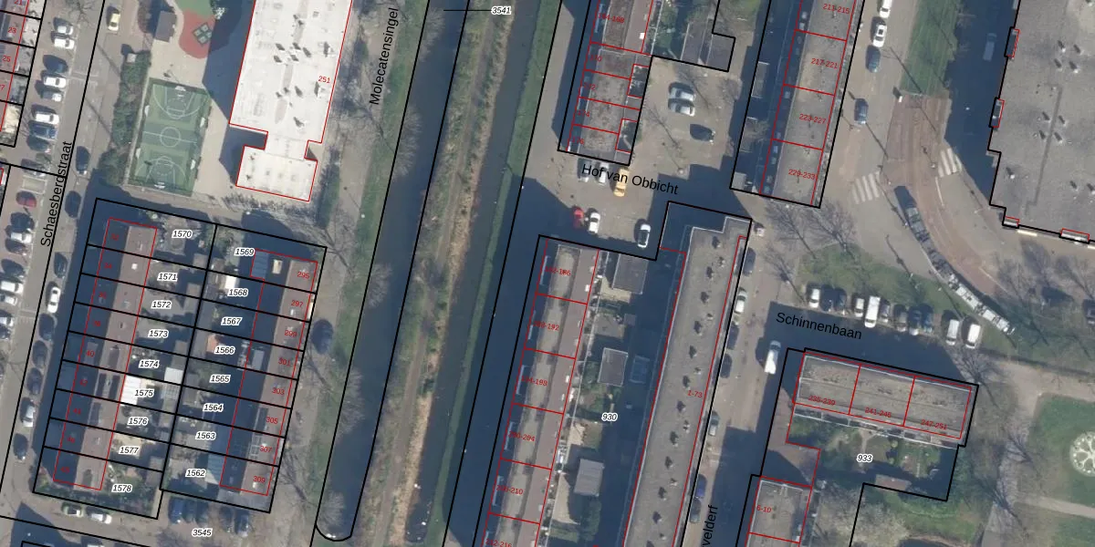 Het perceel waarop Molecatensingel 184 staat heeft een oppervlakte van 2477 m². Dit is een zeer groot perceel. De perceeloppervlakte wordt geregistreerd door het Kadaster. Gedetailleerde informatie over de maten van dit perceel kunt u vinden in het rapport Kadastrale kaart met maatvoering van Molecatensingel 184.