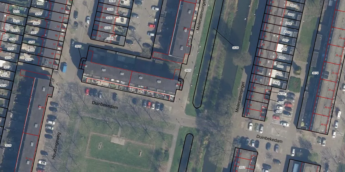 Het perceel waarop Molecatensingel 53 staat heeft een oppervlakte van 3785 m². Dit is een zeer groot perceel. De perceeloppervlakte wordt geregistreerd door het Kadaster. Gedetailleerde informatie over de maten van dit perceel kunt u vinden in het rapport Kadastrale kaart met maatvoering van Molecatensingel 53.