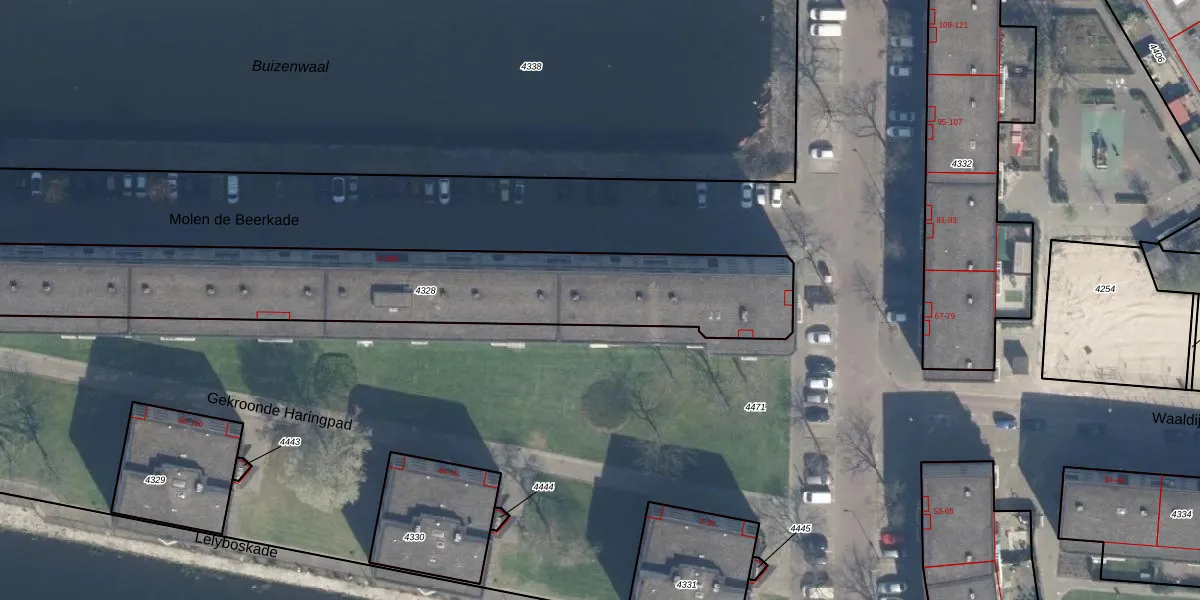 Het perceel waarop het adres ligt is DHV00-A-4328. De afkorting 'DHV00' staat voor kadastrale gemeente Delfshaven. De gemiddelde perceeloppervlakte in de kadastrale gemeente Delfshaven is 628,53 m². Dit perceel is met zijn 1860 m² dus groter dan gemiddeld. De grootste perceeloppervlakte in de kadastrale gemeente is 22,2 ha. De kleinste oppervlakte bedraagt 0 m². Op het perceel zijn 96 adressen aanwezig. In de Basisregistratie Kadaster (BRK) werden de grenzen van het perceel geregistreerd op 01-11-2007.