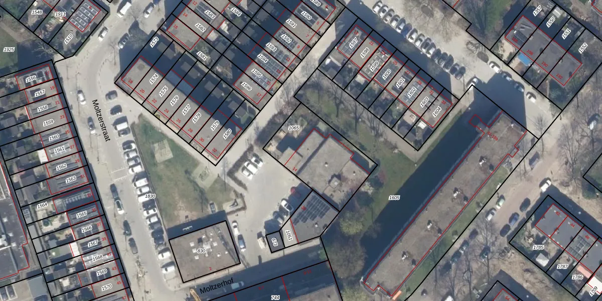 Moltzerhof 14 is gelegen op kadastraal perceel SBK01D1065. Deze kadastrale aanduiding is uniek en wordt gebruikt door het Kadaster om eigendomsrechten en andere zakelijke rechten vast te leggen. Het perceel maakt onderdeel uit van de kadastrale gemeente Schiebroek.