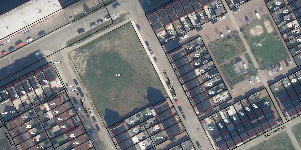 Het perceel waarop Moordrechtstraat 9 staat heeft een oppervlakte van 2608 m². Dit is een zeer groot perceel. De perceeloppervlakte wordt geregistreerd door het Kadaster. Gedetailleerde informatie over de maten van dit perceel kunt u vinden in het rapport Kadastrale kaart met maatvoering van Moordrechtstraat 9.
