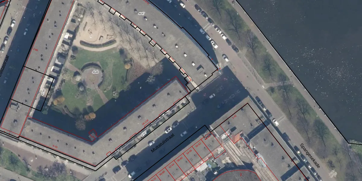 Het perceel waarop Multatulistraat 1-H staat heeft een oppervlakte van 5835 m². Dit is een zeer groot perceel. De perceeloppervlakte wordt geregistreerd door het Kadaster. Gedetailleerde informatie over de maten van dit perceel kunt u vinden in het rapport Kadastrale kaart met maatvoering van Multatulistraat 1-H.