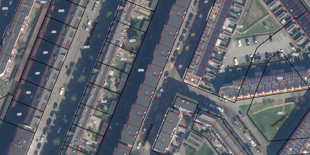 Het perceel waarop Multatulistraat 25-C staat heeft een oppervlakte van 3710 m². Dit is een zeer groot perceel. De perceeloppervlakte wordt geregistreerd door het Kadaster. Gedetailleerde informatie over de maten van dit perceel kunt u vinden in het rapport Kadastrale kaart met maatvoering van Multatulistraat 25-C.