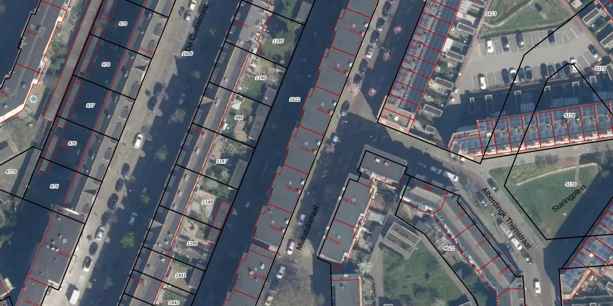 Multatulistraat 27-A is gelegen op kadastraal perceel RTD10Z1612. Deze kadastrale aanduiding is uniek en wordt gebruikt door het Kadaster om eigendomsrechten en andere zakelijke rechten vast te leggen. Het perceel maakt onderdeel uit van de kadastrale gemeente Rotterdam.
