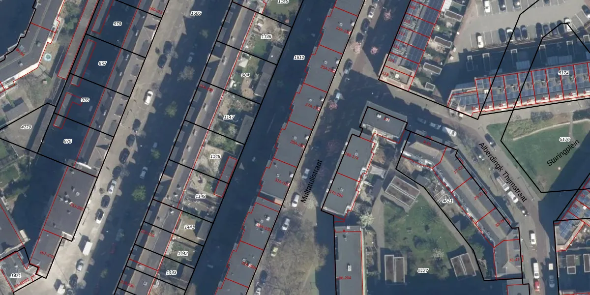 Het perceel waarop Multatulistraat 29-B staat heeft een oppervlakte van 3710 m². Dit is een zeer groot perceel. De perceeloppervlakte wordt geregistreerd door het Kadaster. Gedetailleerde informatie over de maten van dit perceel kunt u vinden in het rapport Kadastrale kaart met maatvoering van Multatulistraat 29-B.