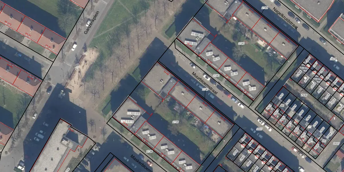 Het perceel waarop Muurbloemstraat 56 staat heeft een oppervlakte van 2410 m². Dit is een zeer groot perceel. De perceeloppervlakte wordt geregistreerd door het Kadaster. Gedetailleerde informatie over de maten van dit perceel kunt u vinden in het rapport Kadastrale kaart met maatvoering van Muurbloemstraat 56.