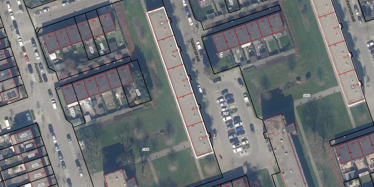 Het perceel waarop Naberstraat 59 staat heeft een oppervlakte van 9120 m². Dit is een zeer groot perceel. De perceeloppervlakte wordt geregistreerd door het Kadaster. Gedetailleerde informatie over de maten van dit perceel kunt u vinden in het rapport Kadastrale kaart met maatvoering van Naberstraat 59.