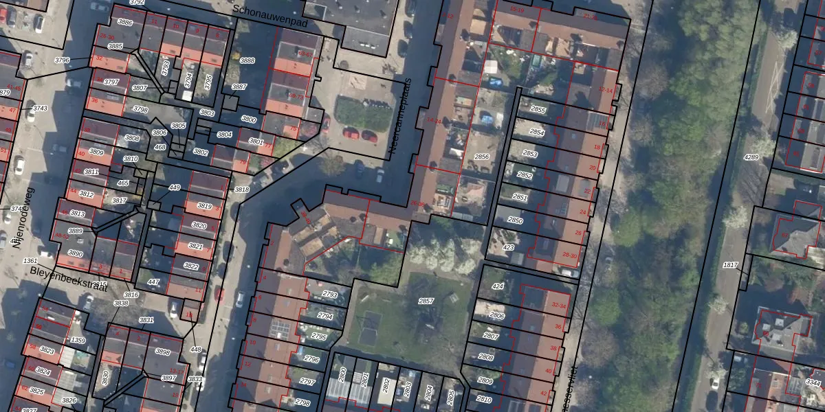 Het perceel waarop Neercanneplaats 30 staat heeft een oppervlakte van 2353 m². Dit is een zeer groot perceel. De perceeloppervlakte wordt geregistreerd door het Kadaster. Gedetailleerde informatie over de maten van dit perceel kunt u vinden in het rapport Kadastrale kaart met maatvoering van Neercanneplaats 30.