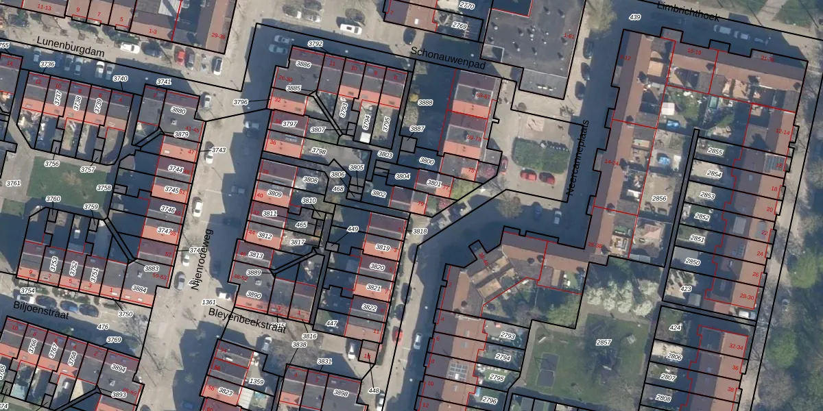 Gebruik de zoekbalk of klik op een perceel voor informatie over de adressen binnen dit perceel.